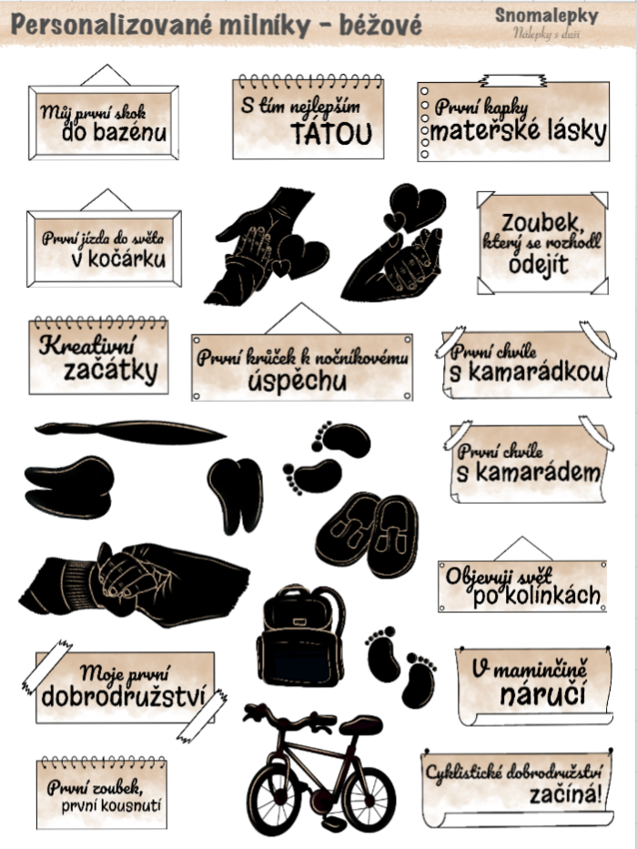Milníkové samolepky pro miminko - se jménem, protože Vaše dítě není "nějaké miminko". První úsměv, první zoubek, první Vánoce,... A protože každé miminko je originál, doplním i jméno - ať se ví, kdo tady dělá ty první krůčky ke slávě.