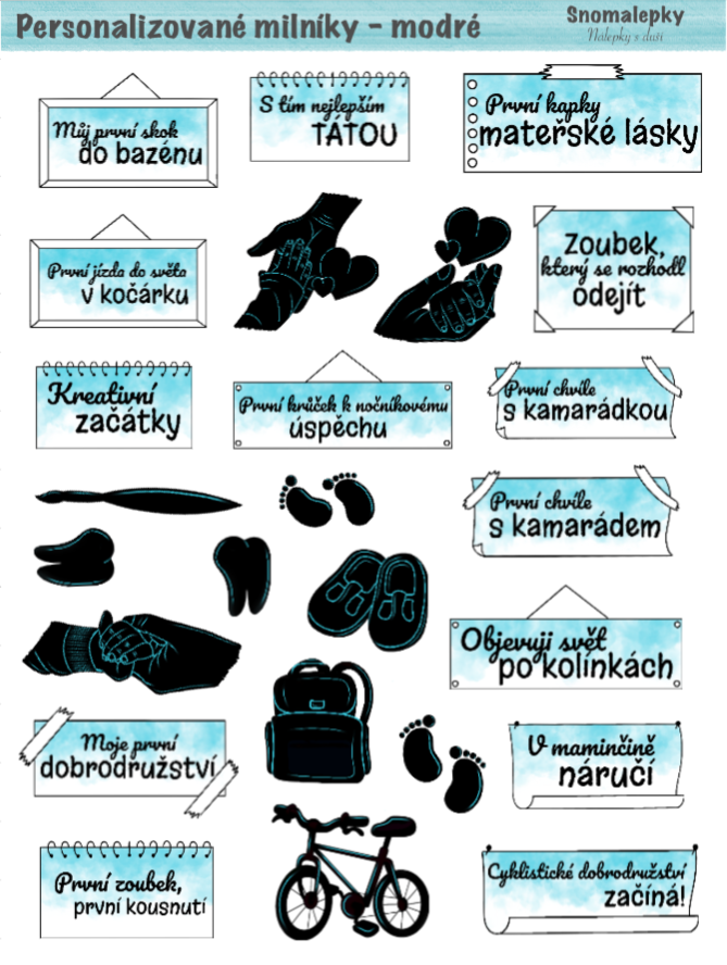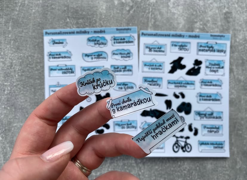 Milníkové samolepky pro miminko - se jménem, protože Vaše dítě není "nějaké miminko". První úsměv, první zoubek, první Vánoce,... A protože každé miminko je originál, doplním i jméno - ať se ví, kdo tady dělá ty první krůčky ke slávě.
