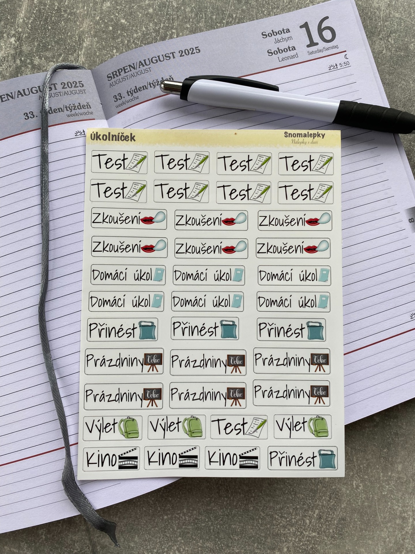 Školní dobrodružství s úsměvem! Samolepky s nápisy jako test, domácí úkol, výlet nebo prázdniny pomůžou dětem zorganizovat si týden a navíc je lepení baví. Ideální do diářů, plánovačů i sešitů.